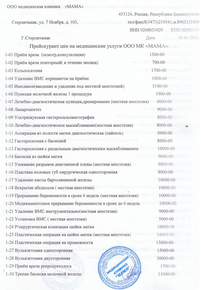 Прейскурант цен на медицинские услуги ООО МК «МАМА» на 01.01.2026 г.
